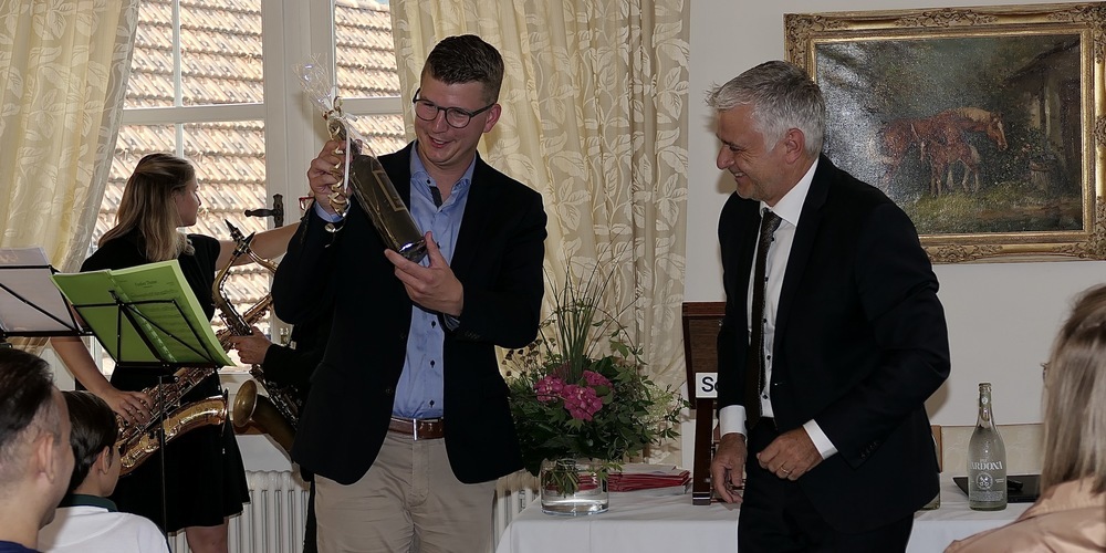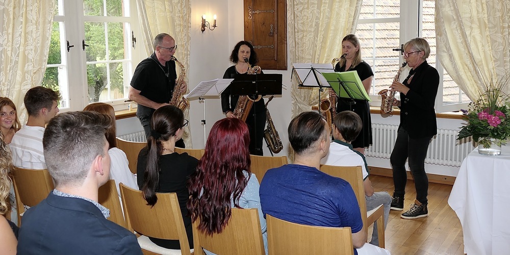 Der vom Riverside-Quartett, das die Feier musikalisch begleitete, auf vier Saxophonen gespielte Queen-Song «Another one bites the dust», führte von daher gesehen auf eine falsche Fährte. Denn niemand hatte «in den Staub gebissen». Vielmehr durften alle Diplomanden mit sich und dem Ergebnis ihrer Arbeiten zufrieden sein. Sie haben damit nach der dualen Berufsausbildung eine weitere Voraussetzung für ihren Berufs- und Lebenserfolg geschaffen. Was in dem vom Riverside-Quartett abschliessend gespielten «We are the Champions» auch gewürdigt wurde.