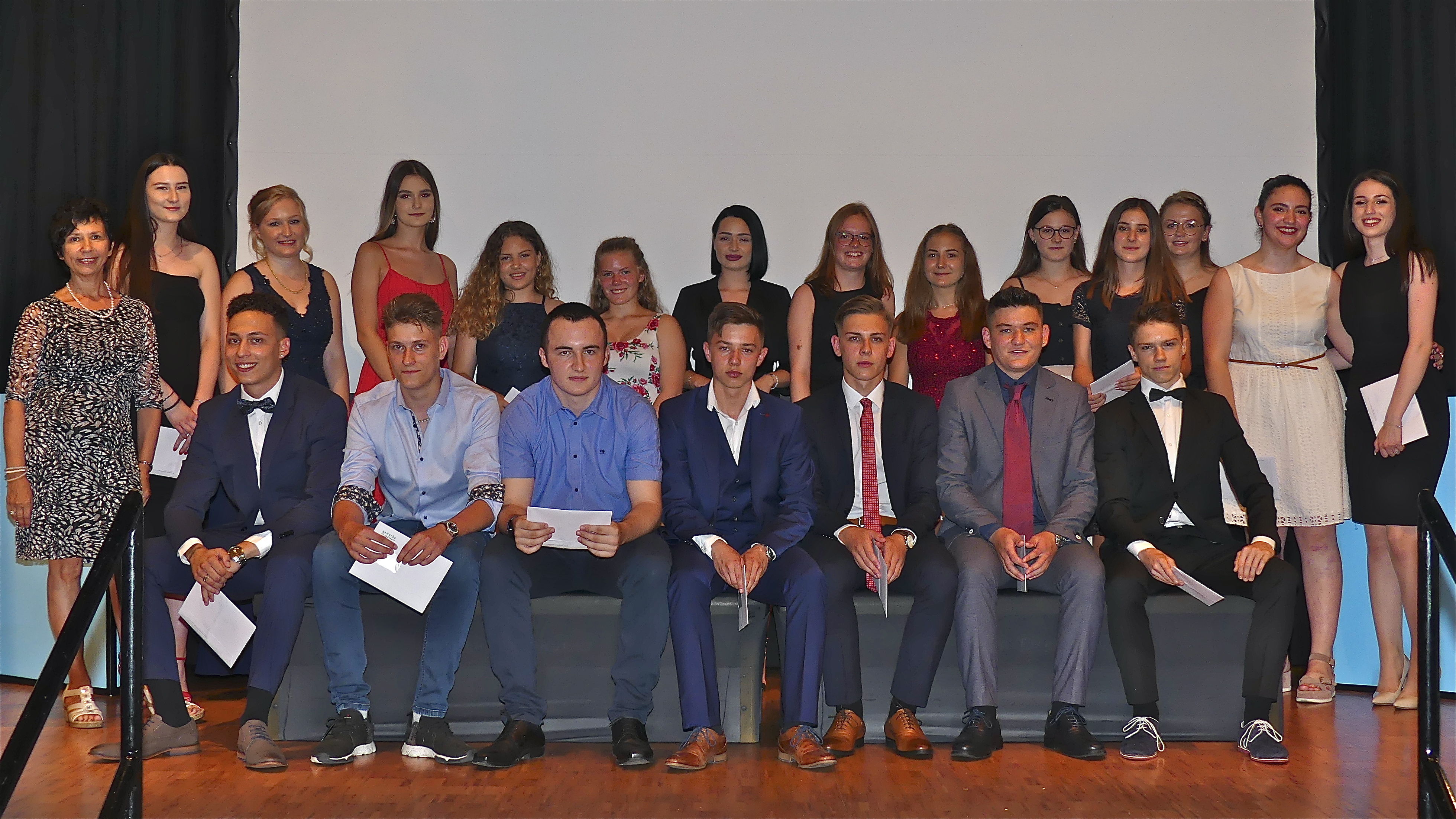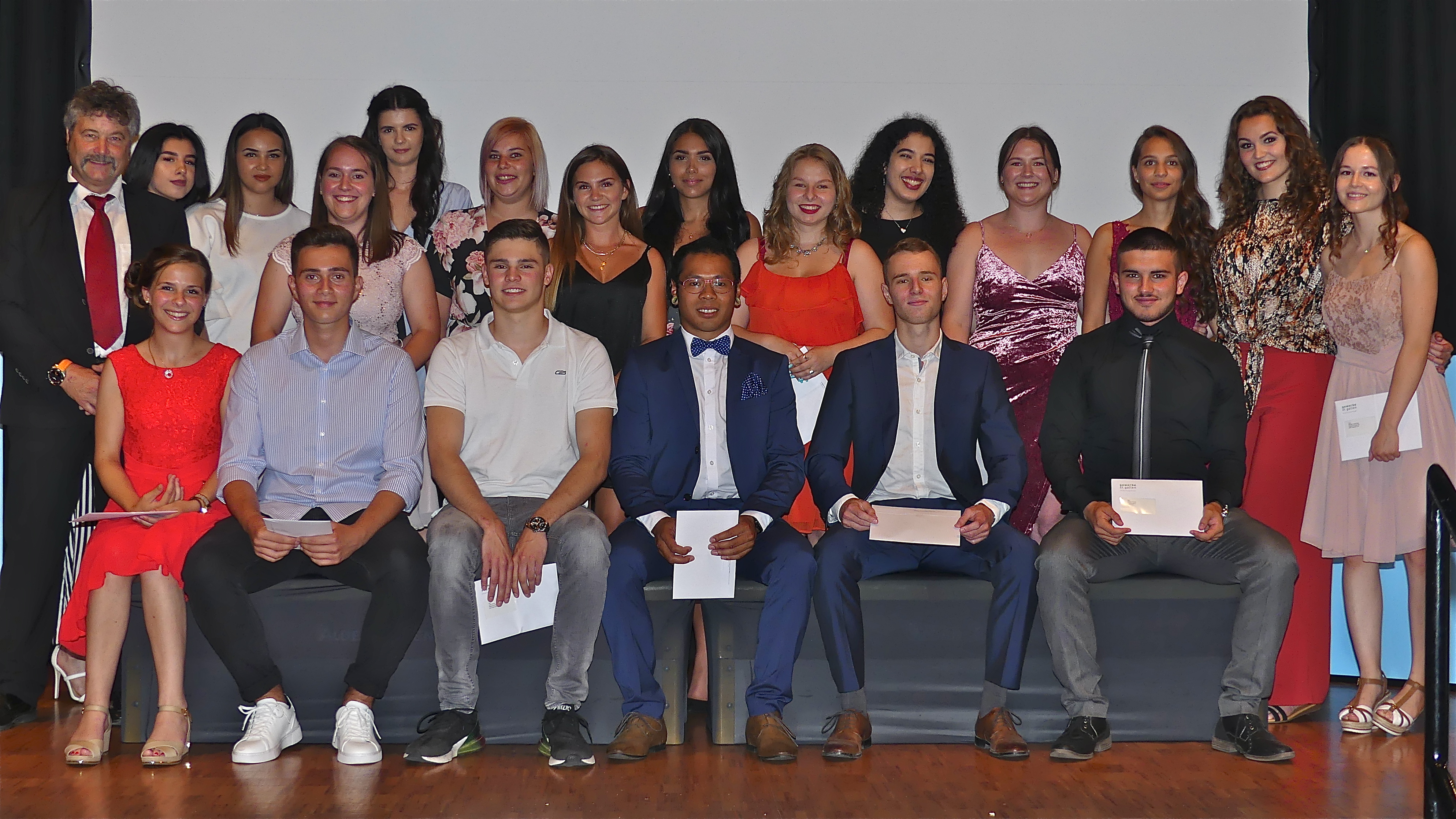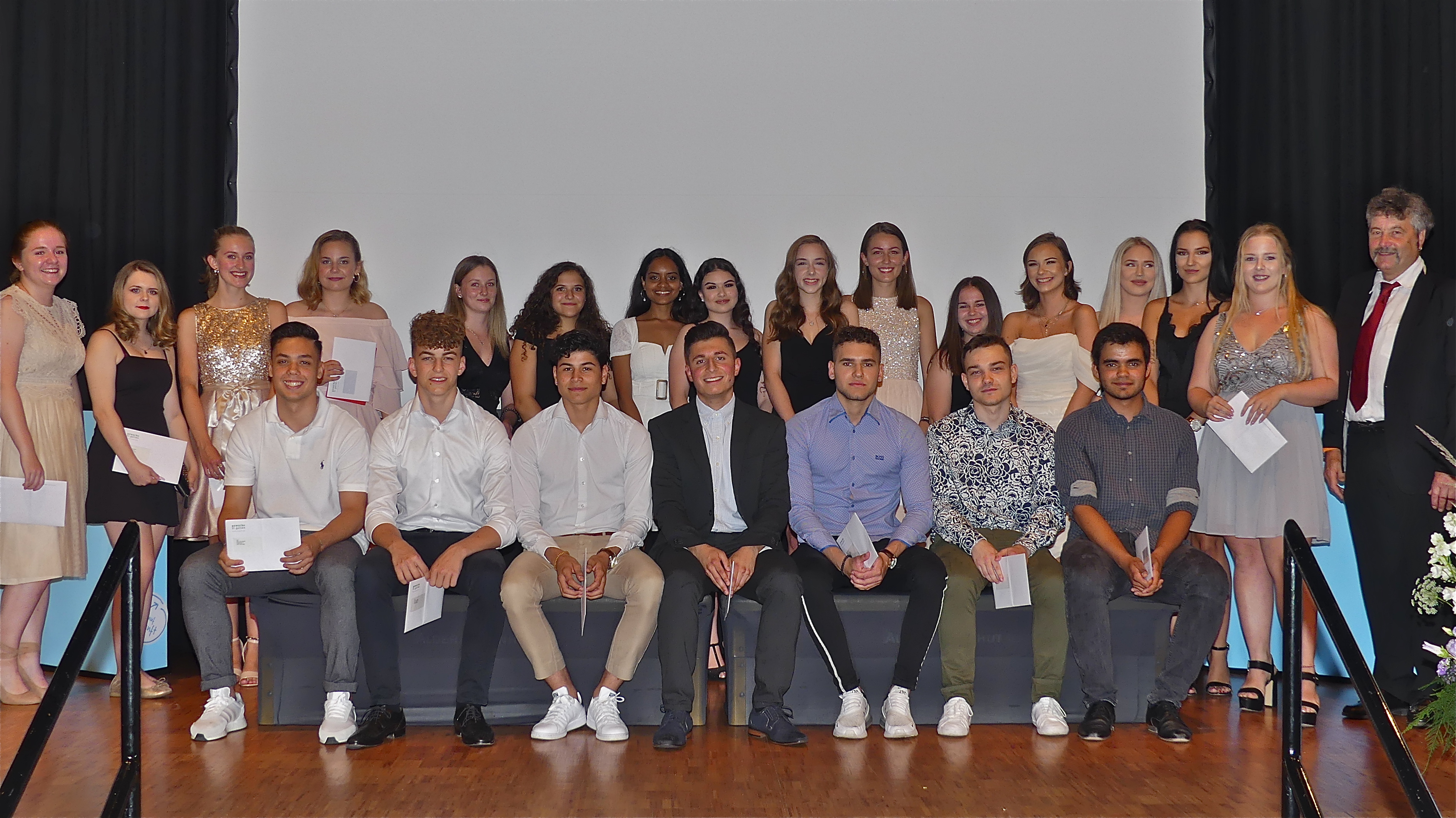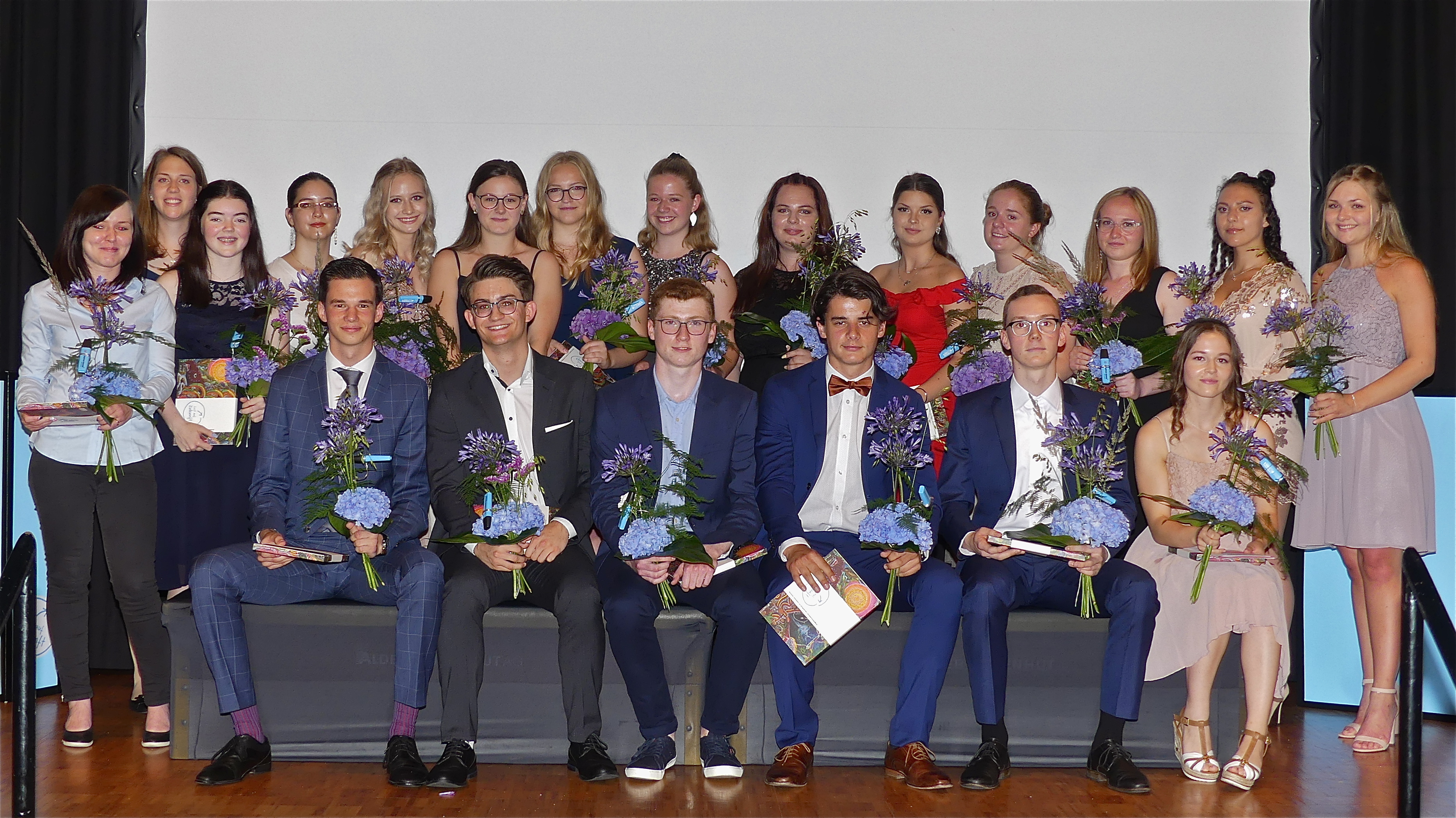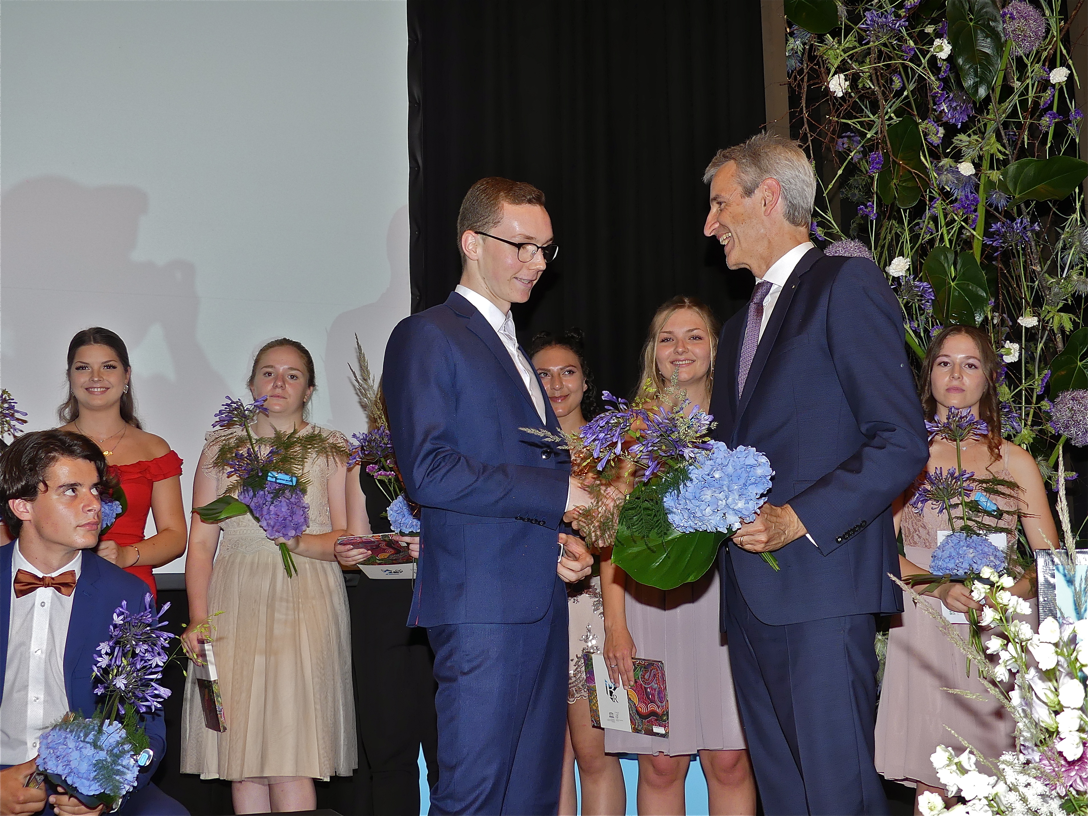 Zahlreiche Absolventen wurden nach Übergabe der Zeugnisse nochmals auf die Bühne geholt und für Notendurchschnitte von 5,3 bis 5,5 gesondert ausgezeichnet. Die besten Noten überhaupt erzielte Dominic Zigerlig aus Oberriet, der einen exzeptionellen Schnitt von sagenhaften 5,7 erzielte.
