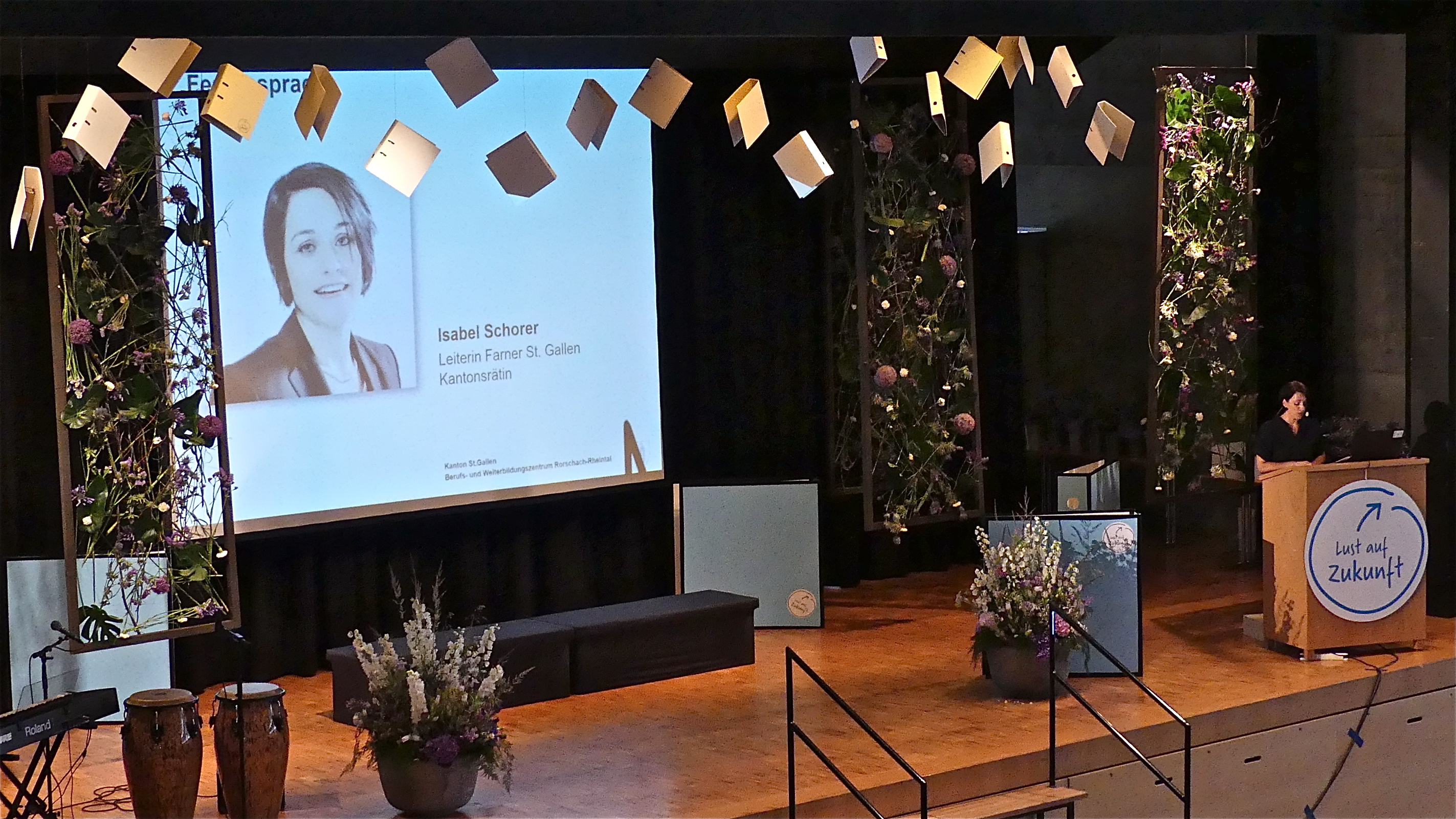 Kantonsrätin Isabel Schorer, Leiterin des Standorts St. Gallen bei der Kommunikationsagentur Farner, nutzte als Festrednerin die Gelegenheit, auf die Notwendigkeit der fortlaufenden Weiterbildung hinzuweisen: «Wer an Neuem interessiert ist, sich weiterbildet, sich etwas Neues zutraut, kann auch in einem neuen Berufsbild wieder Fuss fassen. Genau diese Bereitschaft, diese Neugier auf noch nicht Bekanntes, dieses «sich etwas Zutrauen» sind in Zukunft noch deutlich wichtiger als bisher. Fordern Sie sich ständig heraus!» Anschliessend an die eigentliche Abschlussfeier, die von Rae Amber & Jonas Hütter musikalisch perfekt begleitet wurde, gab es für die insgesamt etwa 700 Teilnehmer der Feierlichkeit noch ein Apéro. Zeit und Gelegenheit, das Erlebte Revue passieren zu lassen, Verabredungen für die Ferienzeit zu treffen, und vielleicht schon Pläne für die berufliche Zukunft zu schmieden.
