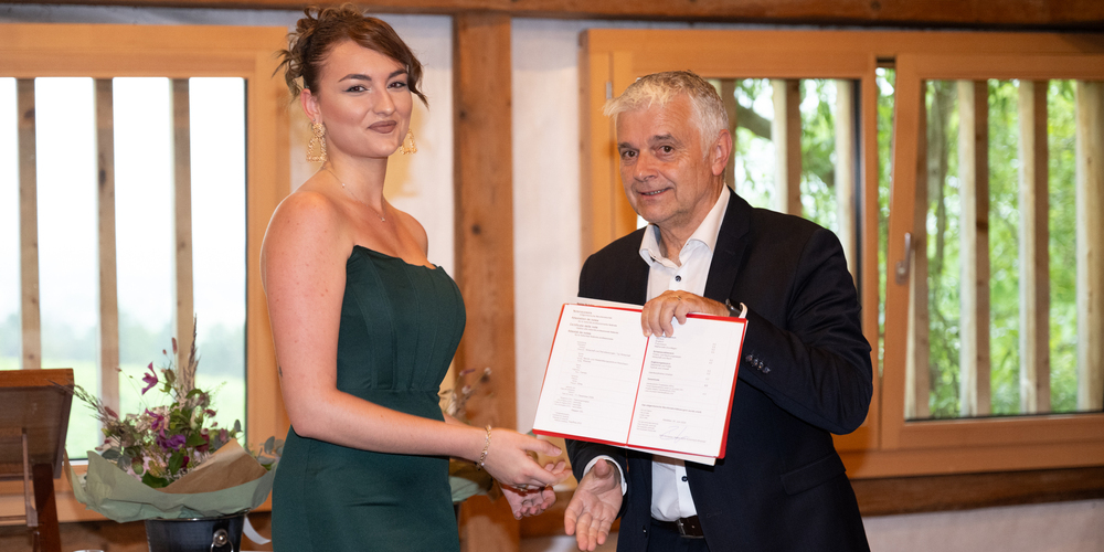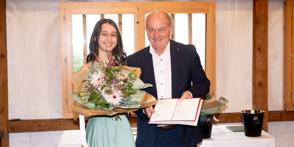 Anschliessend folgte der Höhepunkt dieser in würdigem Rahmen auf dem Marbacher Schloss Weinstein stattgefundenen Diplomfeier: die Übergabe der Maturitätszeugnisse an die 19 diesjährigen Absolventen. Gleich sechs der Diplomanden durften sich über einen Notenschnitt von über 5,0 freuen. Die Besten waren Vesa Gashi aus Oberriet und Ria Lüchinger aus Kriessern mit einem sehr guten Notenschnitt von 5,2.