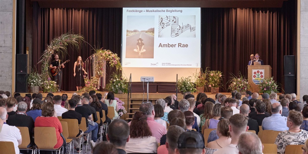 So führten denn auch die beiden Fachbereichsleiter Logistik aus Rorschach und Arbon, Remo Frei und Daniel Kobas, durch die Feierstunde und begrüssten alle Eltern, Berufsbildner, Verwandten und Freunde der stolzen Absolventen. Für die musikalische Umrahmung sorgte die bekannte Sängerin Amber Rae mit ihrem kongenialen Begleiter auf der Gitarre Daniel Koch.