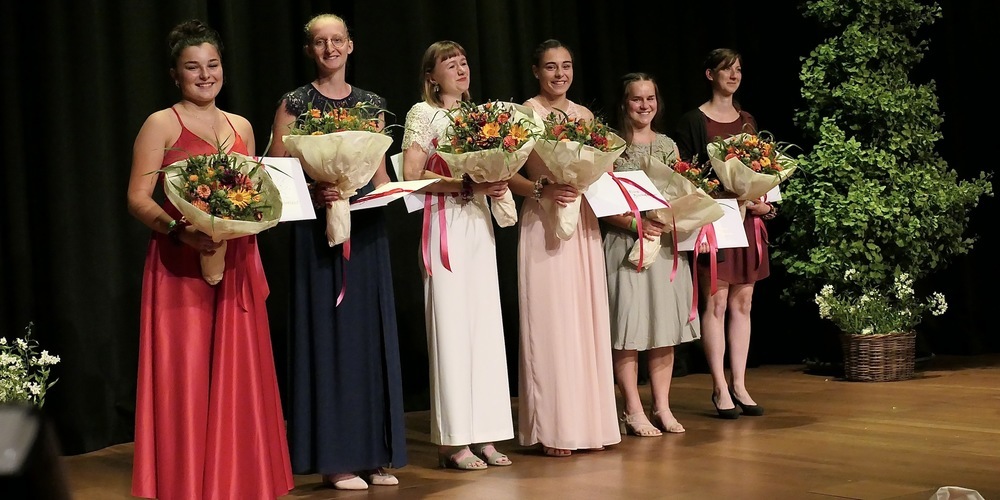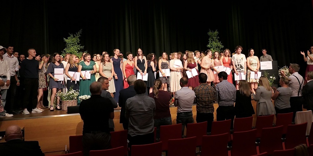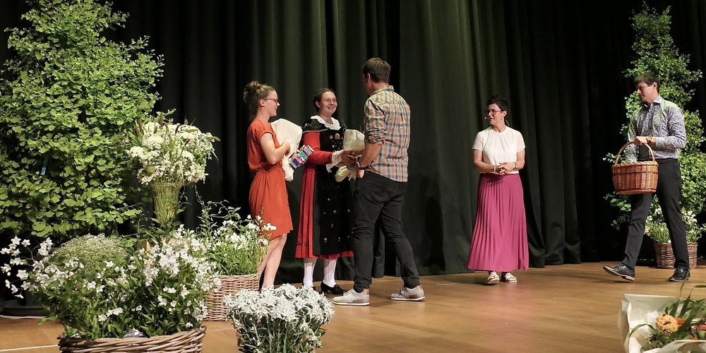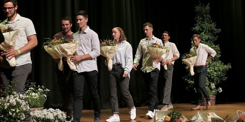 Der Höhepunkt des Abends kam mit Notenverlesung aller Gärtnerinnen und Gärtner und aller Floristinnen und Floristen und der Übergabe der eidgenössischen Fähigkeitszeugnisse und dem tosenden Applaus des Publikums, als sich alle zusammen auf der Bühne zusammengefunden hatten.