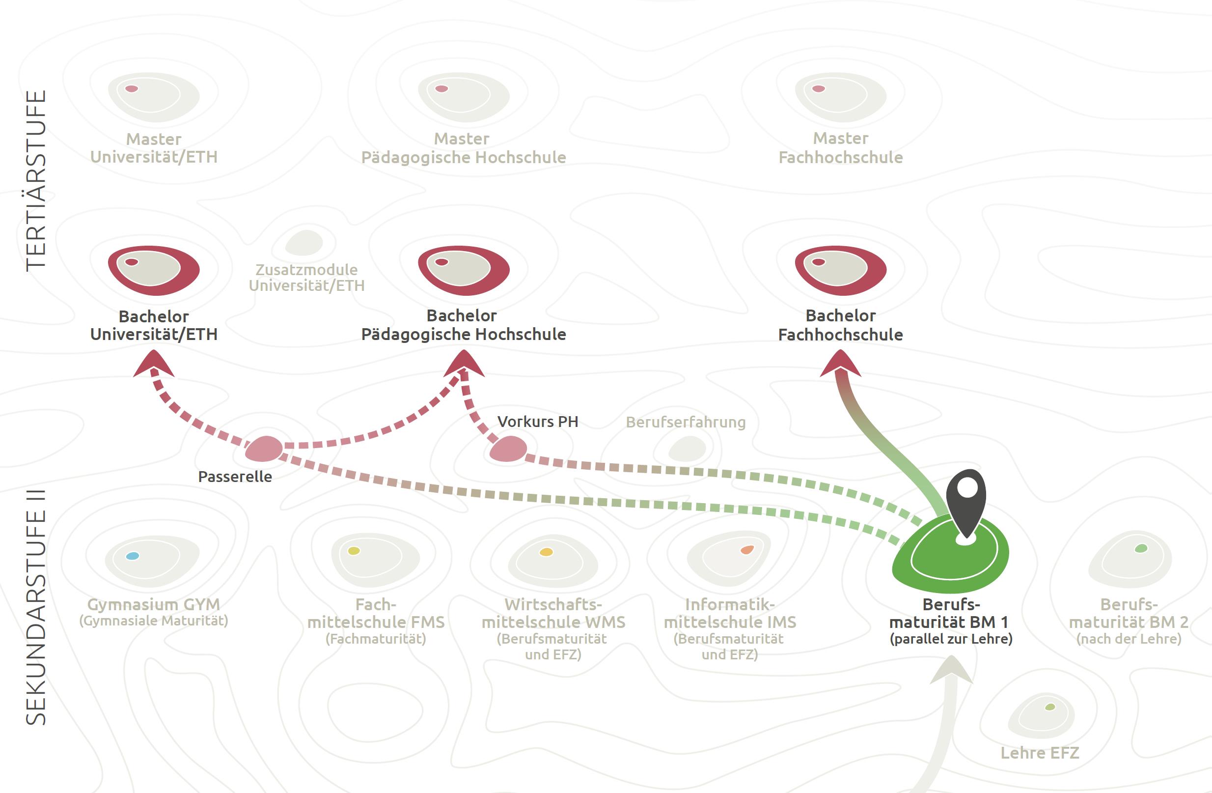Die Berufsmaturität wird in der Ausrichtung Wirtschaft und Dienstleistungen (WD-W) angeboten. Sie dauert 3 Jahre und führt neben dem eidgenössischen Fähigkeitszeugnis gleichzeitig zum Berufsmaturitätsausweis. Dieser ermöglicht gezielt den prüfungsfreien Eintritt in die Fachhochschule für Wirtschaft, aber auch den Zugang zu anderen Fachhochschulrichtungen. Mit der Passerelle öffnet sich zudem die Möglichkeit zum Besuch der Lehrpersonenausbildung oder zu einem universitären Studium.
