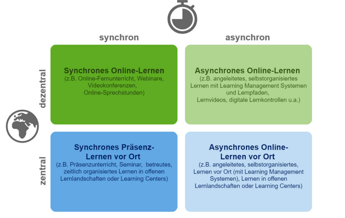 Blended-Learning-Ansätze sind formelle Lehr- und Lernangebote, die in organisierten Bildungsgängen und in einer definierten Lehr-Lern-Beziehung stattfinden, wobei zentrale, dezentrale, synchrone und asynchrone Lernphasen wirksam kombiniert und integriert werden. Ein wesentliches Merkmal von Blended Learning besteht darin, dass die Lernenden unter Verwendung digitaler Technologien phasenweise zeit- und ortsunabhängig, also auch asynchron, lernen und somit das eigene Lerntempo und die eigenen Lernwege selbst bestimmen können. Neben solchen asynchronen Lernphasen sind gemeinschaftliche Lernphasen, die synchron-zentral, d.h. unter der Leitung der Lehrperson in der Bildungsinstitution stattfinden, ein weiteres konstituierendes Merkmal von Blended Learning.